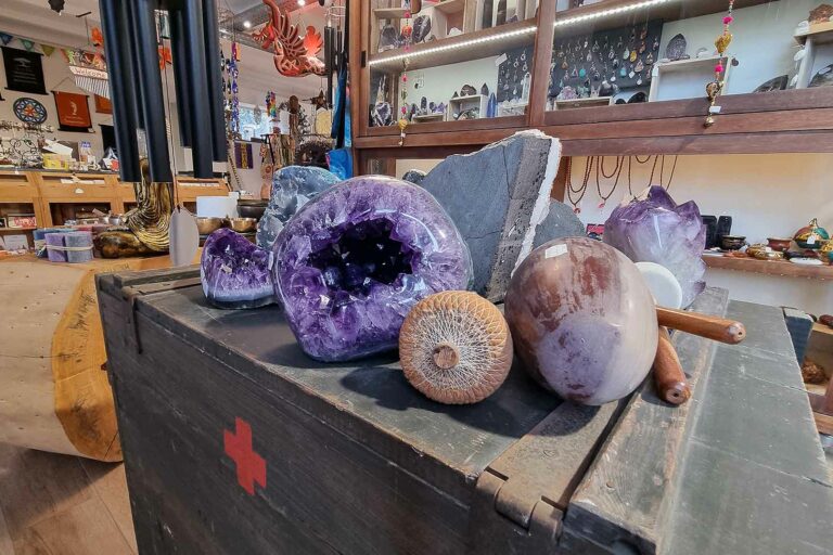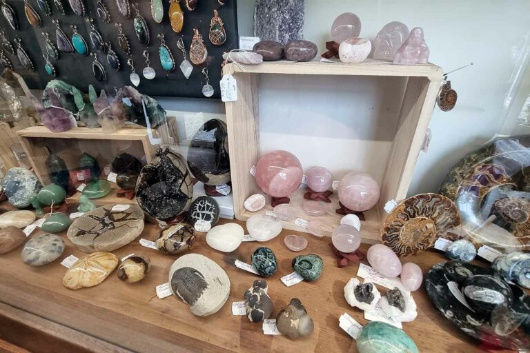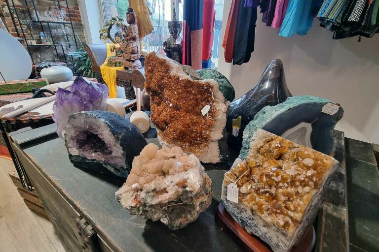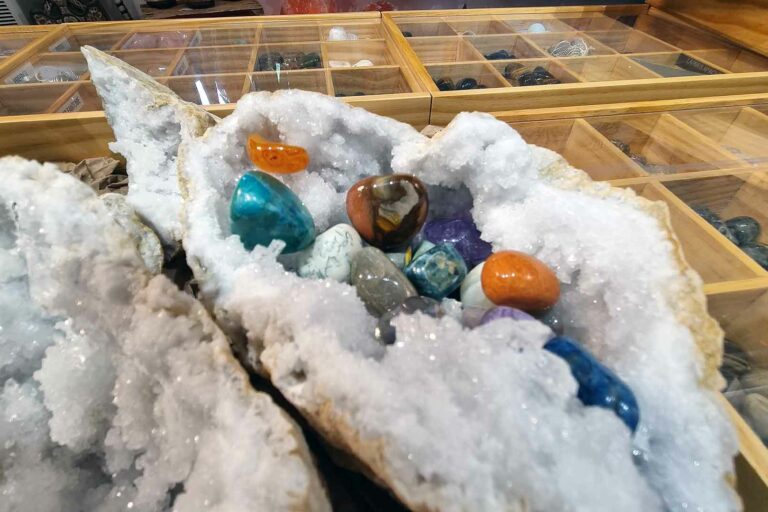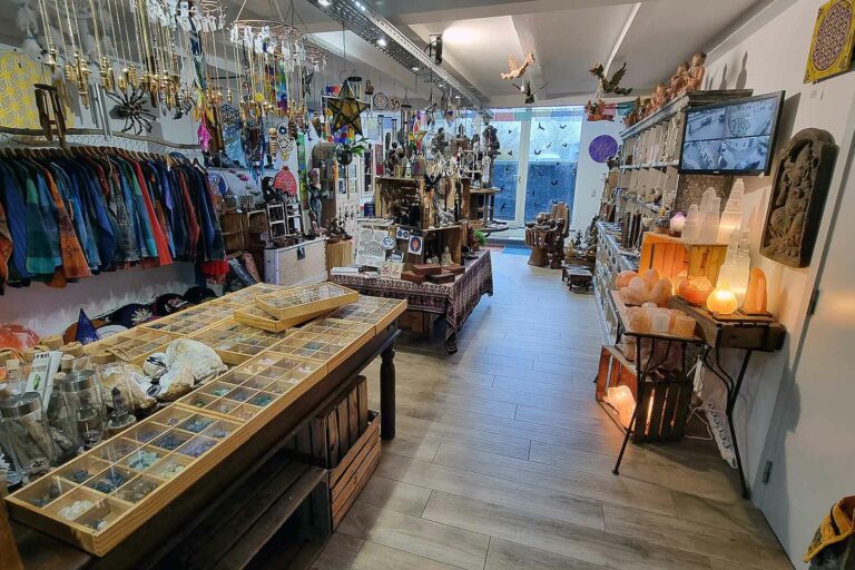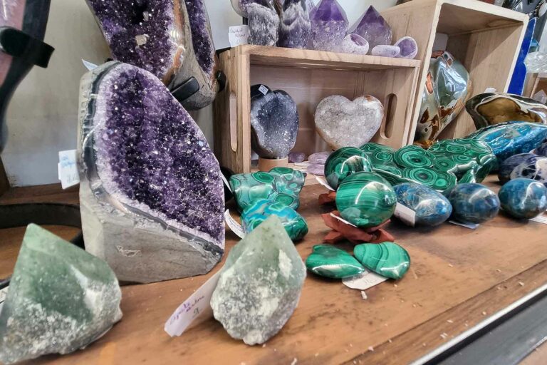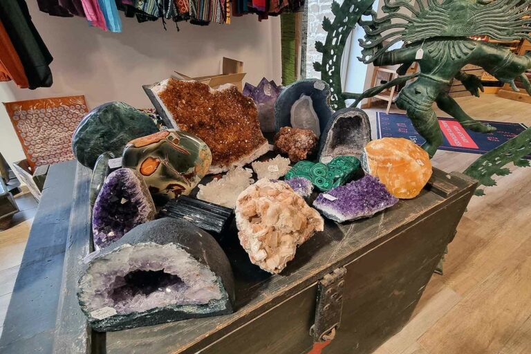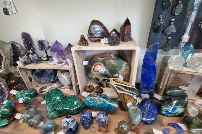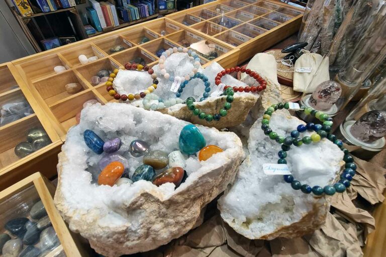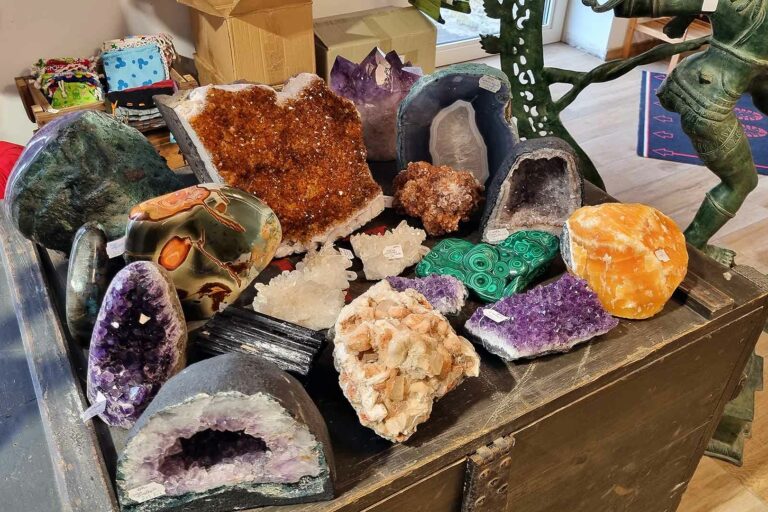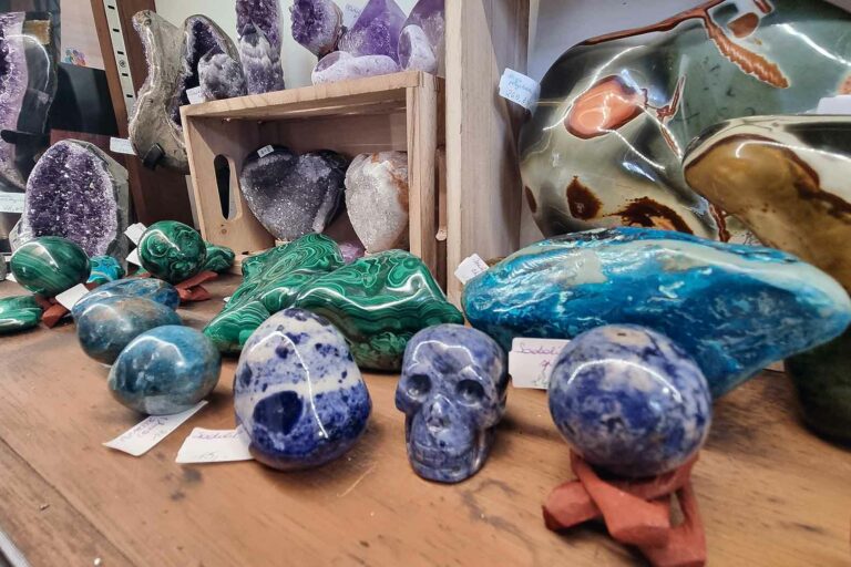 Venez découvrir environ 150 variétés de pierres roulées à glisser en poche et autant en pierres taillées montées en bracelets et pendentifs. Améthyste, fluorite, calcédoine, calcite, cornaline, citrine, chrysocolle, aventurine, bronzite, malachite, pierre de soleil, opale, quartz… Ce n’est pas le choix qui manque ! Marie-Noëlle cherche avec vous la pierre qui vous convient, éventuellement en fonction de vos chakras. Un praticien vous a recommandé une pierre en particulier ? ArtMano vous la présente ou la trouve pour vous si elle n’est pas en magasin.