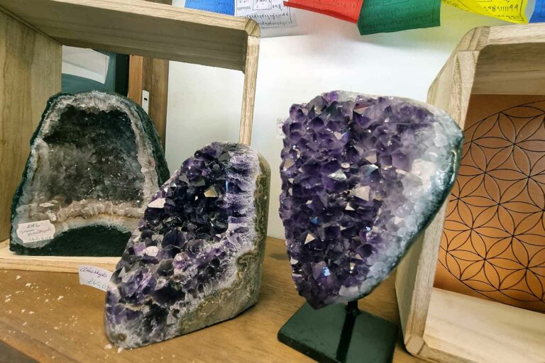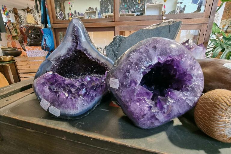ArtMano vous propose diverses géodes polies ou à l’état brut : améthyste, cristal de roche… Les géodes sont des cavités rocheuses (parfois de grande taille), creuses, tapissées intérieurement de cristaux et de forme arrondie. Ne les confondez pas avec les druses qui, elles, sont relativement plates. À l’instar des pierres roulées, on dit des géodes qu’elles apportent du bien-être, de l’énergie, des bienfaits sur le mental… Posez votre géode dans votre environnement (bureau, salle de séjour, hall, chambre, table de nuit…) pour équilibrer vos chakras et améliorer l’atmosphère de votre lieu de vie. Ou exposez ce bel objet dans votre salon pour le plaisir des yeux.